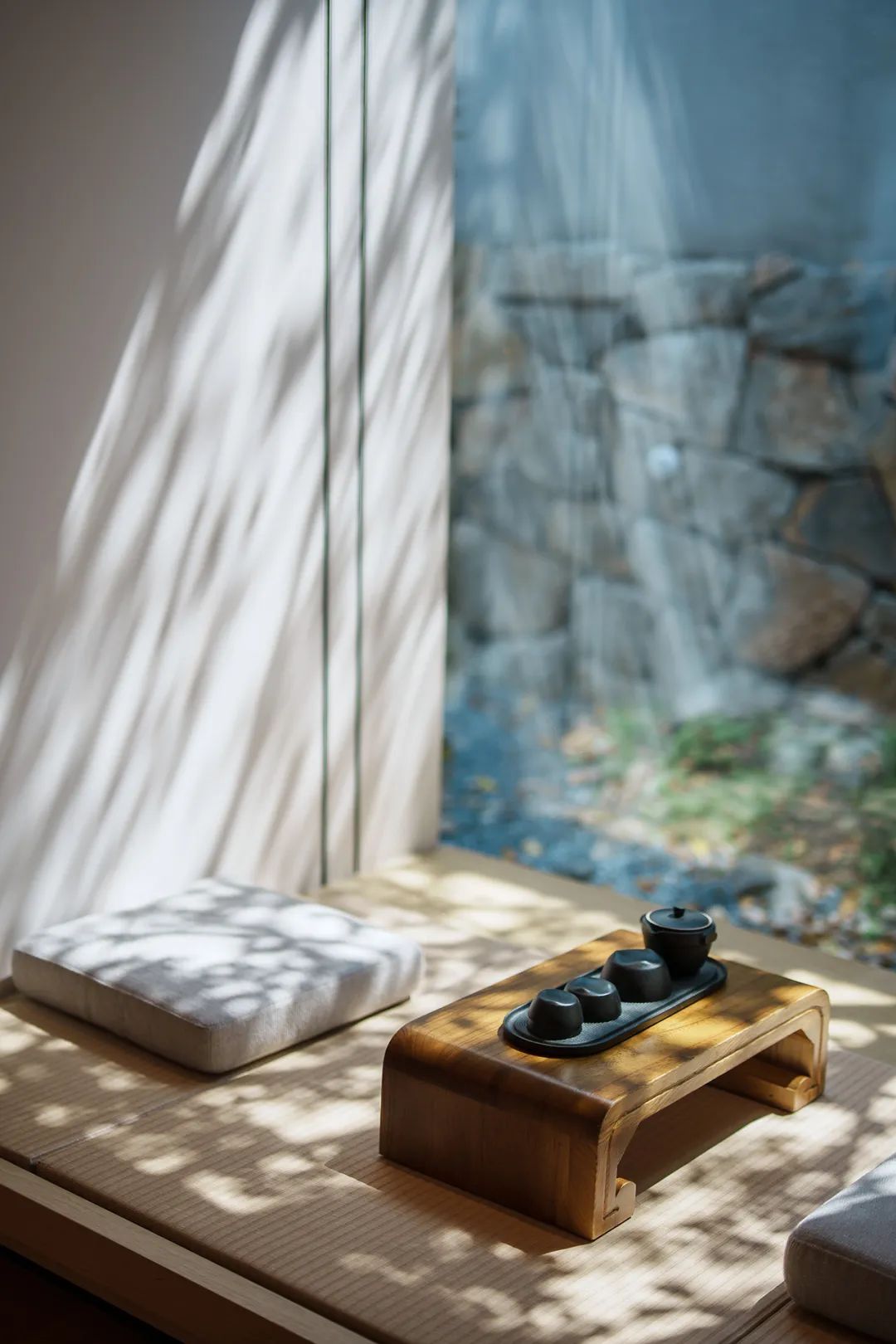 旅馆宛如一首静默的诗篇,于文化街区中悄然绽放 。四座古板木构屋顶修建围合而成,内敛而蕴藉,吐露出古朴而深沉的韵味 。阁楼静立,佛塔高耸,佛殿庄重,与山中禅寺遥遥相对,配合谱写禅宗修行的千古传奇 。
